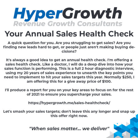 It’s always a good idea to get an annual health check. I’m offering a sales health check. Like a doctor, I will do a deep dive into how your sales function is performing. This is a full 2 hour diagnostic interview, using my 20 years of sales experience to unearth the key points you need to implement to hit your sales targets this year. Normally $250, I am offering this for a give away price of $100 for the first people to book.